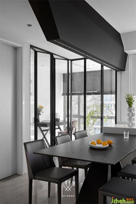 吝色黑白灰,破而重組的開闊,空氣里光的振動隨之翩翩;開放式廚房、半開放式書房,流動的空間給予的讓步,餐邊柜默念著禮貌加入的詞根。