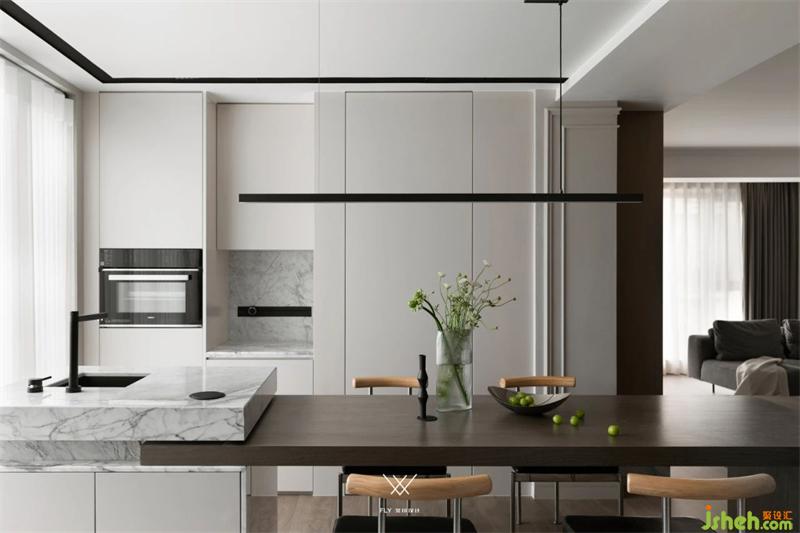 Change the adjacent kitchen space for the dining room, do meals flow line; Combined with the elements of western kitchen island, built-in kitchen appliances are placed, space functions are replaced and complementary, local embarrassment of the space is adjusted, the use density between regions is uniform, and the space attributes are diversified.