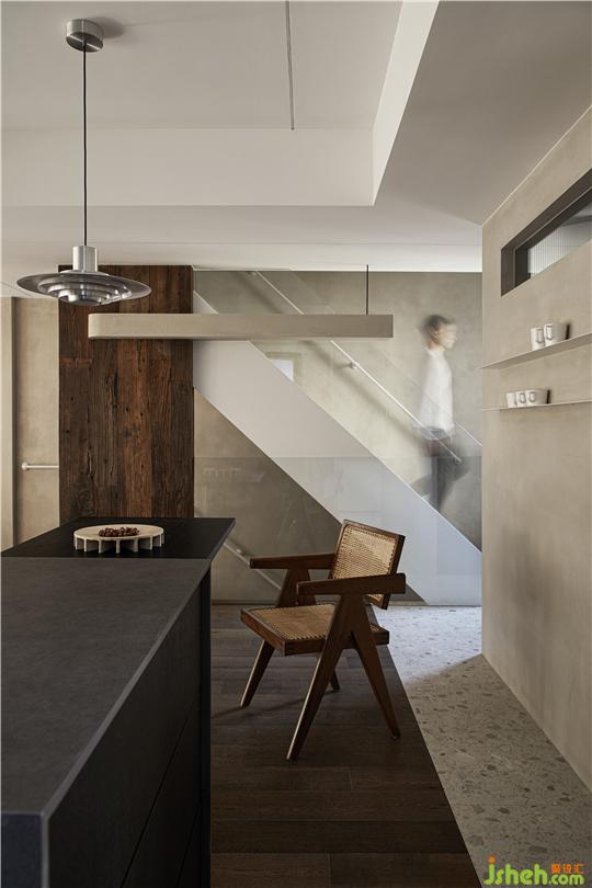 客廳在房頂做梁,樓梯做柱,建筑藝術穿插結構的形式將老木頭放置其間,滿足居住者家居空間里要有老木頭運用的要求。