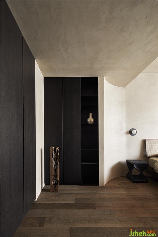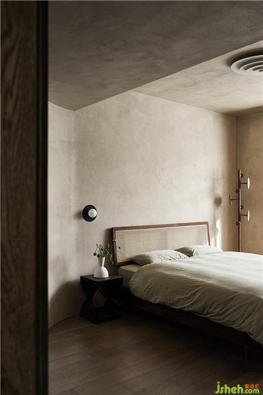 臥室主打暖色調(diào),選用偏黃色藝術(shù)漆營(yíng)造老房子土墻效果,沒(méi)有冗贅的裝飾,歸還純粹的睡眠空間。杭州家居設(shè)計(jì)重組空間結(jié)構(gòu),柜體推入墻體,墻面延伸曲面連至衣柜,空間銜接順暢干凈。