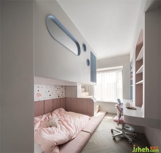 兩個小朋友的睡眠空間,杭州秀隱翠精裝房改造打造燦日余暉、閃閃發(fā)光的童話氛圍,鋼架結(jié)構(gòu)組建上下雙層床,分色處理劃分兩人空間,多處做圓角處理,是細節(jié)處給予孩童的安全保護。