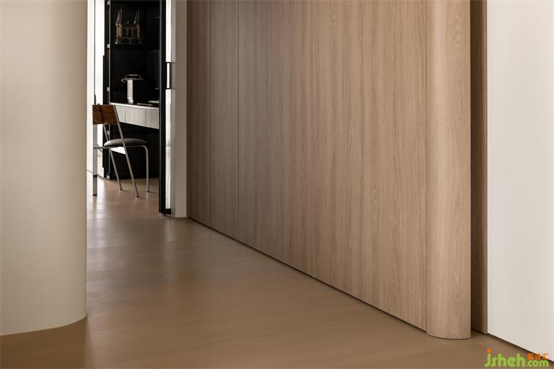 集結(jié)多種功能屬性——衣帽間、書(shū)房、洗衣區(qū)于同一空間內(nèi)妥善安排,整合空間的利用率與便利性,且將之以相對(duì)開(kāi)放的姿態(tài)呈現(xiàn),雙移門(mén)得以應(yīng)對(duì)不同情景下的空間需求,空間互通性與獨(dú)立性兼具。柜門(mén)以鏡面手法擴(kuò)容視覺(jué)空間,杭州海潮雅園裝修設(shè)計(jì)在保證充足的儲(chǔ)物空間下協(xié)調(diào)其帶有的體量,平衡家居功能與空間體感的雙重需求。