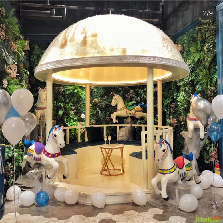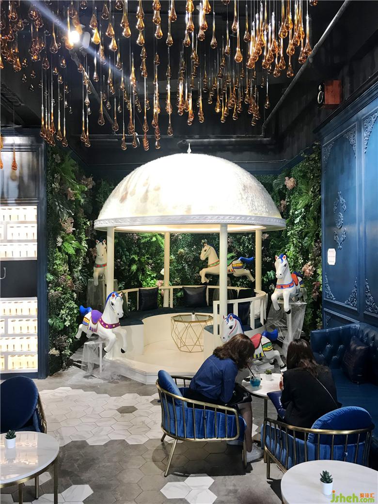 中間是一個(gè)高腳杯的展示區(qū),通過(guò)燈光的照耀下,顯得格外高檔,拍照凹造型真的太適合不過(guò)了。后面的旋轉(zhuǎn)木馬亭子,加上墻身的綠植,給到客戶一種森林夢(mèng)幻的意境,讓人不想離開(kāi)這里。