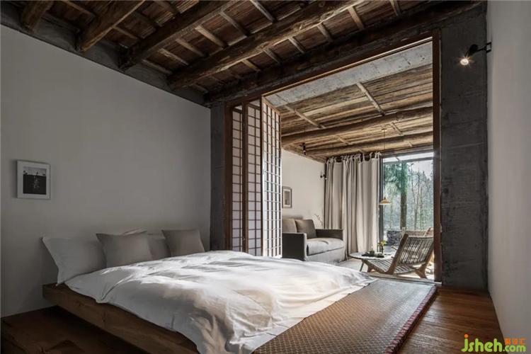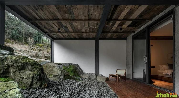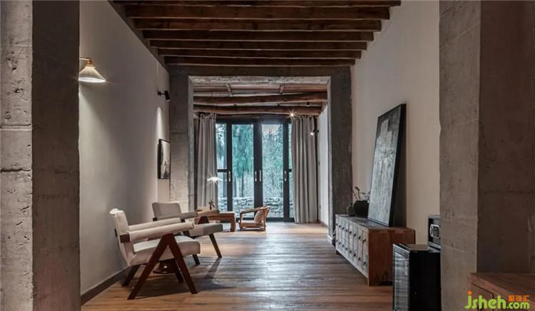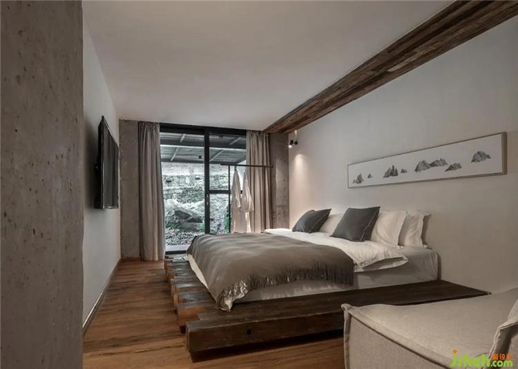 挑高的空間架構(gòu)中,通過天花與墻面連續(xù)的設(shè)計(jì),塑造出空間整體風(fēng)格的延伸性,各個(gè)區(qū)域直接的轉(zhuǎn)換自然而流暢,從而打破了常規(guī)民宿空間的形制特點(diǎn)與界分感,于簡單中加以微妙的轉(zhuǎn)折,呈現(xiàn)出空間簡凈大方的當(dāng)代氣息。