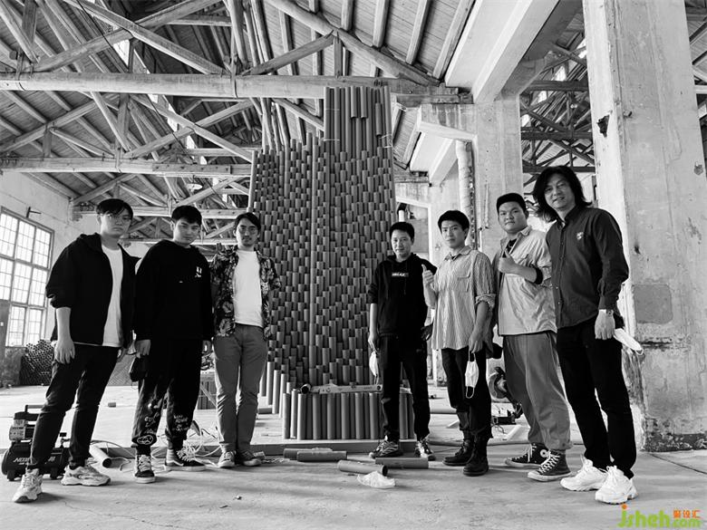 在搭建的第三天晚上,還遭遇了重慶史上難遇的9級(jí)大風(fēng),因?yàn)楝F(xiàn)場(chǎng)是廢舊的廠房,早已無(wú)完整的長(zhǎng)門和窗外做遮擋,作品的力學(xué)支撐也還未完全成型,前幾天搭建好的損壞了近三分之一。