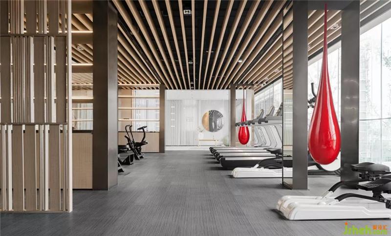 健身區(qū)占據(jù)東側(cè)開(kāi)間,臨窗的條件和高度優(yōu)勢(shì)使運(yùn)動(dòng)人士在揮灑汗水的同時(shí)也能保持著疏朗的心情。紅色的水滴藝術(shù)裝置既起到分隔的功能,也平衡了空間的色彩,使運(yùn)動(dòng)的瞬間更添熱力和動(dòng)感。