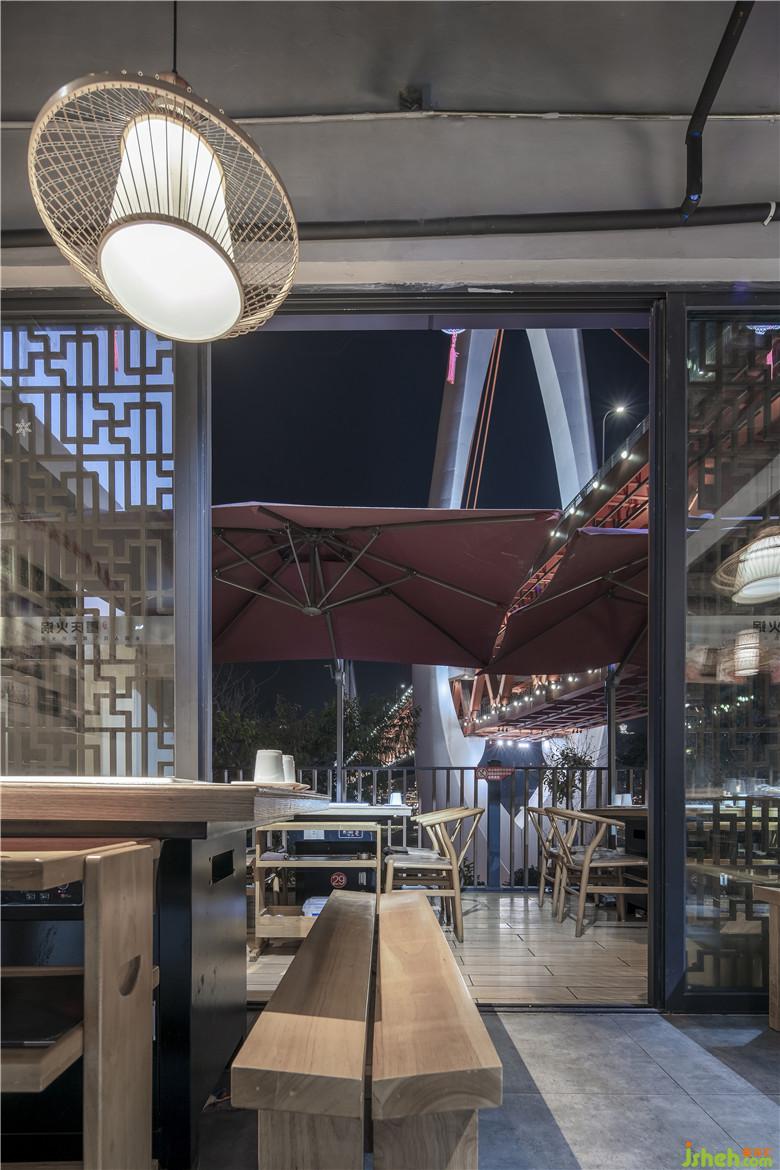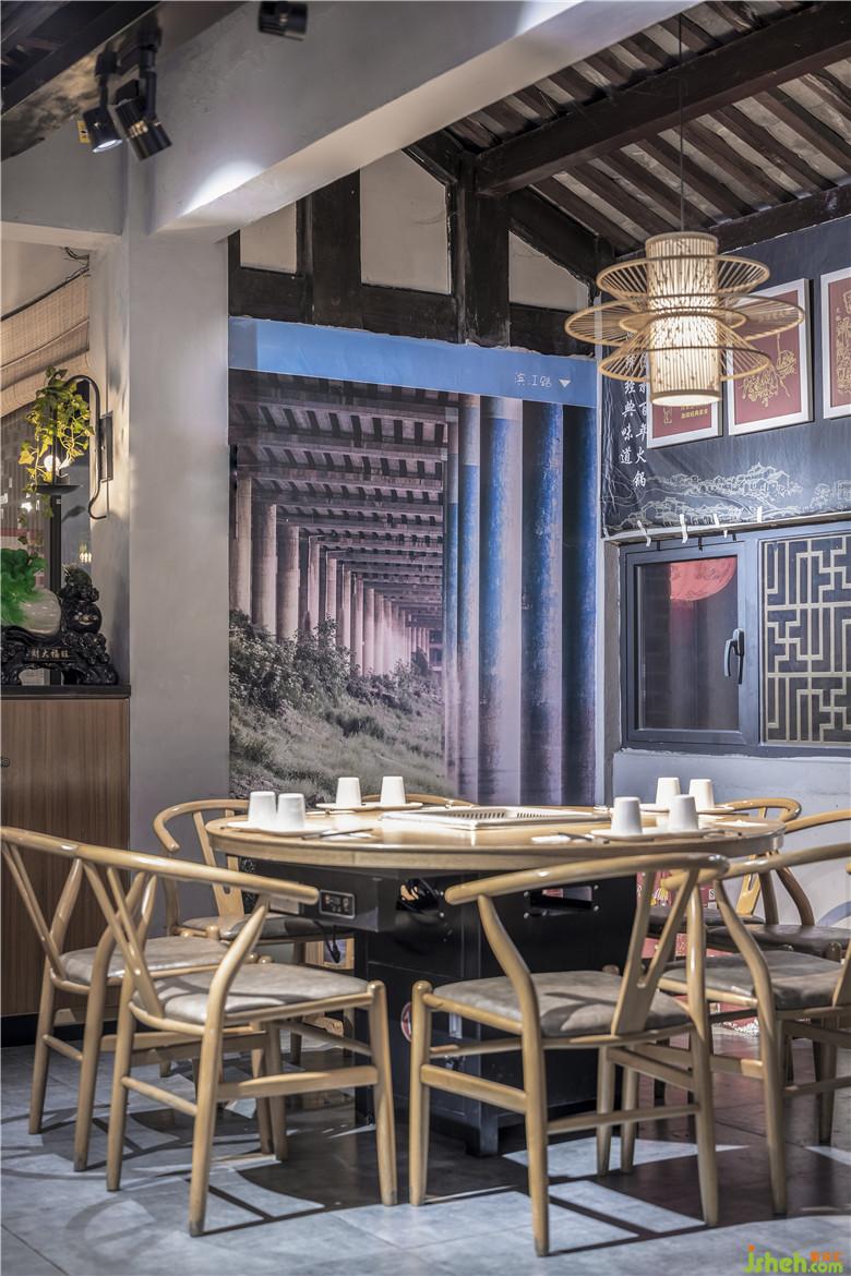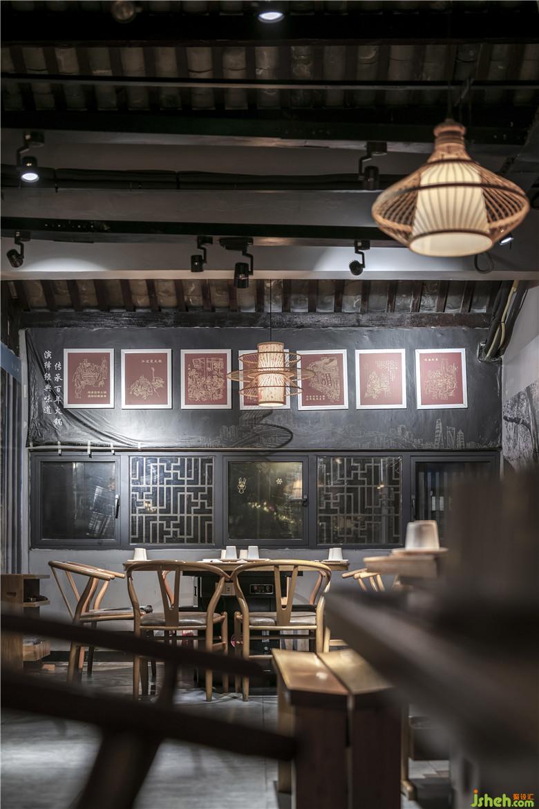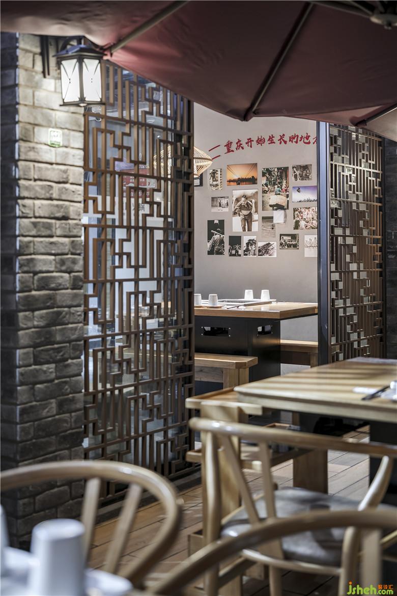 從紅色的東水門大橋獨特的色彩構(gòu)成,獲得靈感,既然周圍的建筑設(shè)計融合了鮮亮的建筑元素符號,為什么不可以結(jié)合重慶本地青磚綠瓦運用于空間設(shè)計呢?同時,始建于清乾隆二十四年(1759年)的湖廣會館,亦是見證過重慶成為繁華商埠的歷史,而且在建筑和設(shè)計上,也是體現(xiàn)出對藝術(shù)自身審美的高度要求。所以在三樓包廂,紅色醒目的宣傳語:“只做地道老重慶味道”,大膽采用了紅色,掛在墻壁的白色勺子,滿滿的豌豆、綠豆和辣椒等等,與之互相呼應(yīng)。餐廳設(shè)計