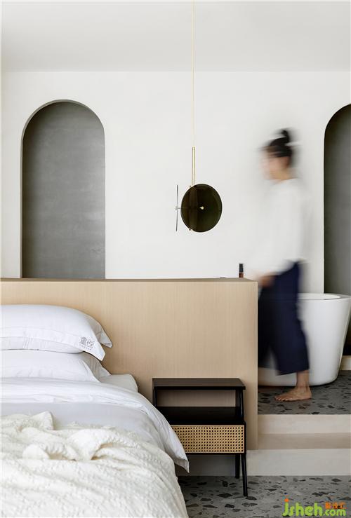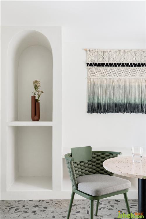 埂上設(shè)計在軟裝上規(guī)避過多雜飾與設(shè)色,在白色與木色的基調(diào)上,用別致的吊燈、彩色陶罐等圓潤的弧形單品裝點,令材質(zhì)的肌理在細(xì)膩與粗糲之間發(fā)生著對話,質(zhì)實而空靈,成為空間意境營造的最佳注腳。