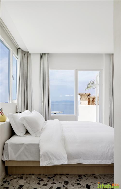 空間最大限度地將室外風(fēng)景引入室內(nèi),客房的每扇窗戶都被精心安排,朝向最美的視角開設(shè),為來客細(xì)細(xì)收集這里的每一刻光景。透過細(xì)框落地窗遠(yuǎn)眺出去,清藍(lán)的海與山成了一幅框景,日出的璨斕、海浪的長歌、晚霞的溫柔……空間將流動而纏綿的自然詩意納入日常之中,予人安適舒愜之感。酒店設(shè)計