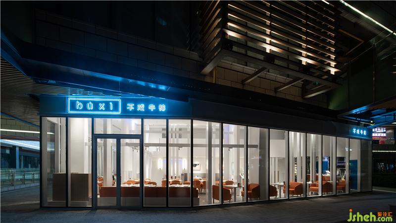 “環(huán)繞的玻璃肋已經(jīng)為我們的‘柱林’形成了第一階段的包裹感與層次感,與我們在內(nèi)部因?yàn)榈缆废到y(tǒng)設(shè)置的‘柱林’形成的其他層次疊加在一起,很容易讓人模糊室內(nèi)與外界的邊線?!边@種模糊,無形中放大了空間的場地與氛圍,視線上通透的用餐環(huán)境也會讓人有種開闊與放松的心境,從而把人們的注意力引到品味牛排本身上來。餐廳設(shè)計
