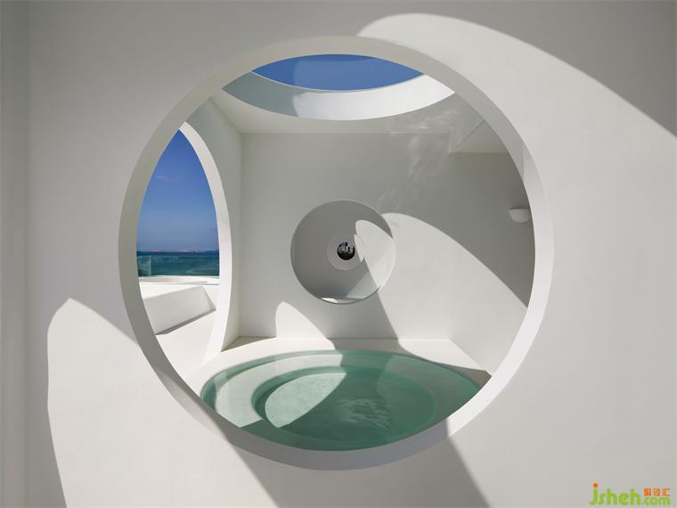從無邊泳池延伸出去,精品酒店設(shè)計(jì)當(dāng)視線觸及純白與碧藍(lán)的無形銜接處,人的知覺和想象自然而然地轉(zhuǎn)移至天臺(tái)之上。
