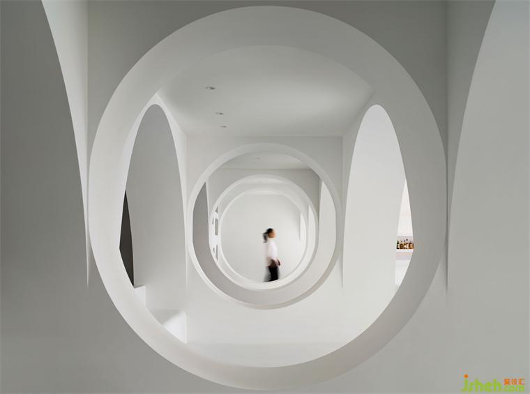 在純白背景下,精品酒店設(shè)計(jì)酒瓶的造型陣列與酒液的金黃色調(diào)成為空間一抹亮晶晶的點(diǎn)綴。人們?cè)谶@里任意移動(dòng),或站、或坐、或游,都可以找到觀賞落日余暉的最佳視角,一杯小酒,一場(chǎng)瑰麗光影,一段浪漫時(shí)光。
