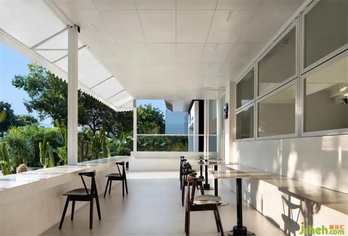 通過縱向開啟的窗打通室內(nèi)外空間的聯(lián)通,餐廳設(shè)計(jì)這種開放性的設(shè)置,消解了體驗(yàn)邊界的限制。不但可以讓在外的行人直觀的參與店中的發(fā)生場(chǎng),同時(shí)能讓坐于店內(nèi)客人聯(lián)通往來的現(xiàn)實(shí)世界。