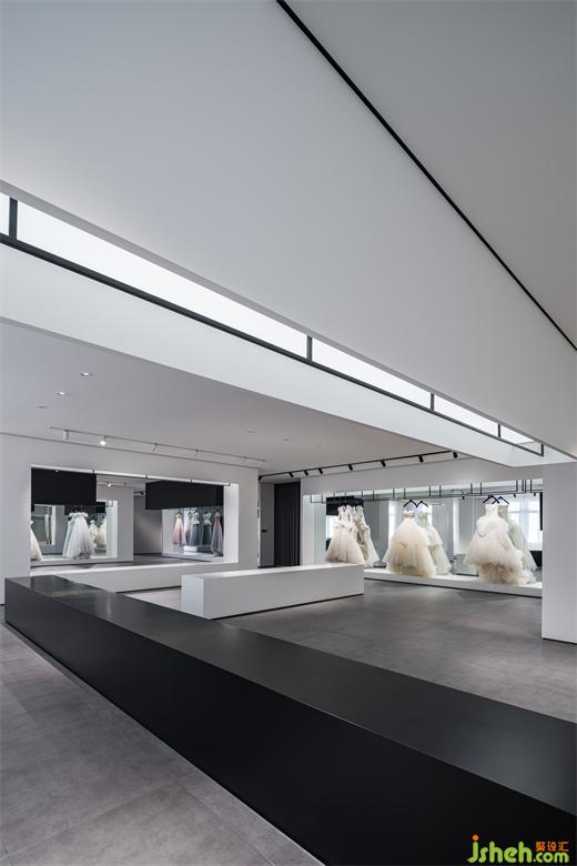 基于WANG FENG產(chǎn)品系列的婚紗和禮服兩大類別,禮服展廳設(shè)計使用空間體塊穿插的手法,自然勾勒出兩大展示體系的聚焦??v橫交錯的體塊陣列,消解了傳統(tǒng)櫥窗展示的秩序,讓品牌更自由、更近人。