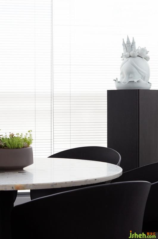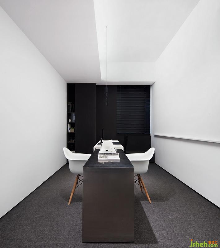 作為辦公空間前區(qū)(公共區(qū)域)的設(shè)計,設(shè)計師在空間中置入了一個向四面伸展的爆炸形裝置,如同一個多個方向的漏斗,連接著各個不同的功能空間,成為交通核的同時又為各個空間提供釆光與通風。傾斜的黑白構(gòu)圖打破一些平衡,形成一些視錯覺,活躍了空間氣氛。