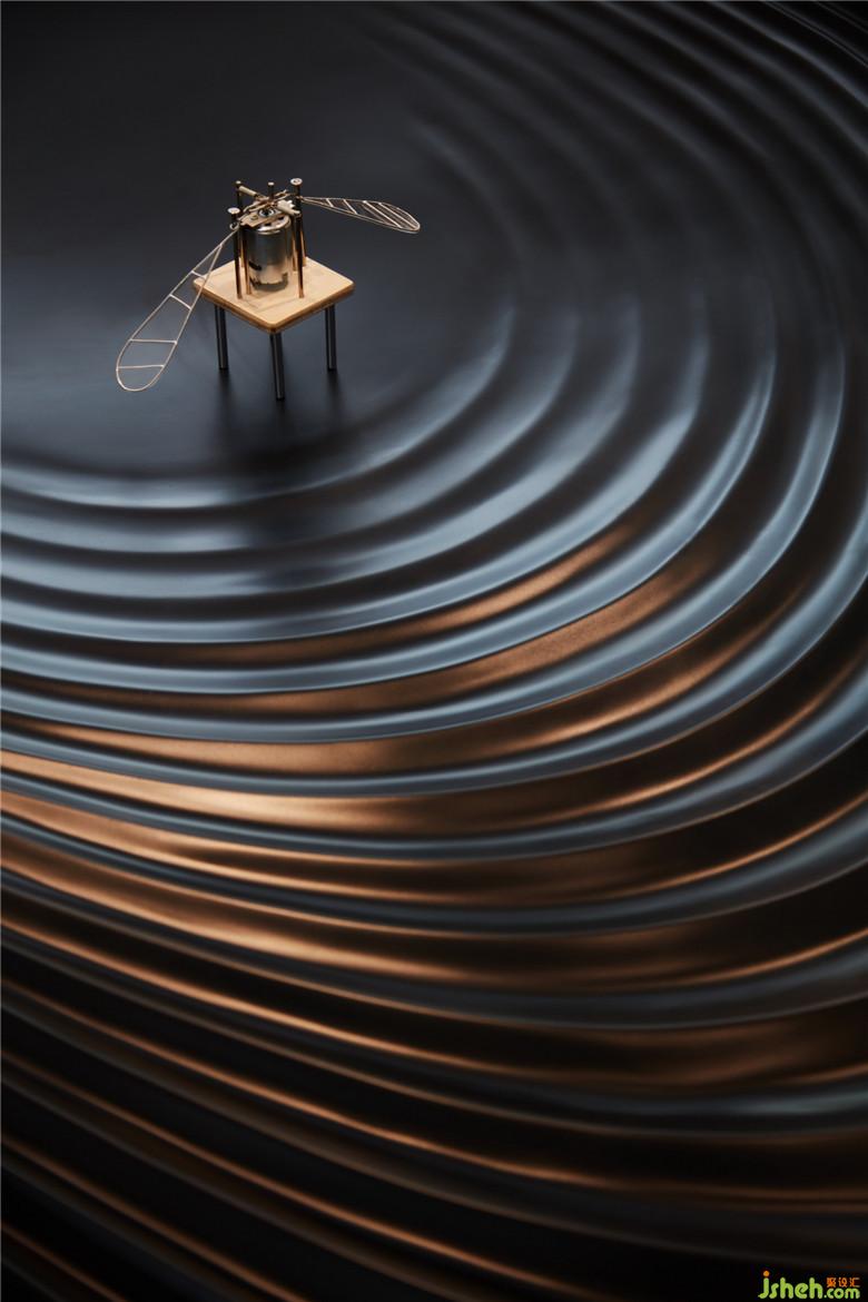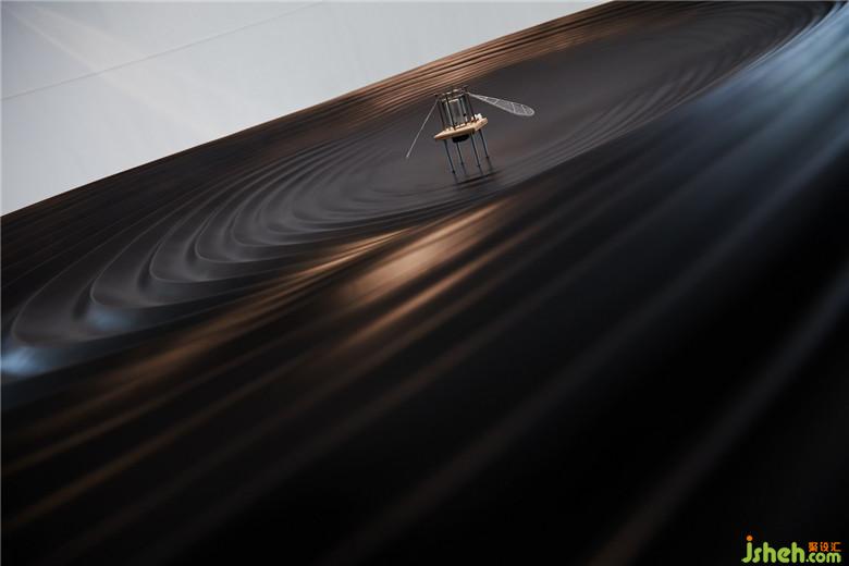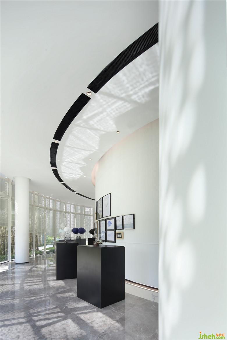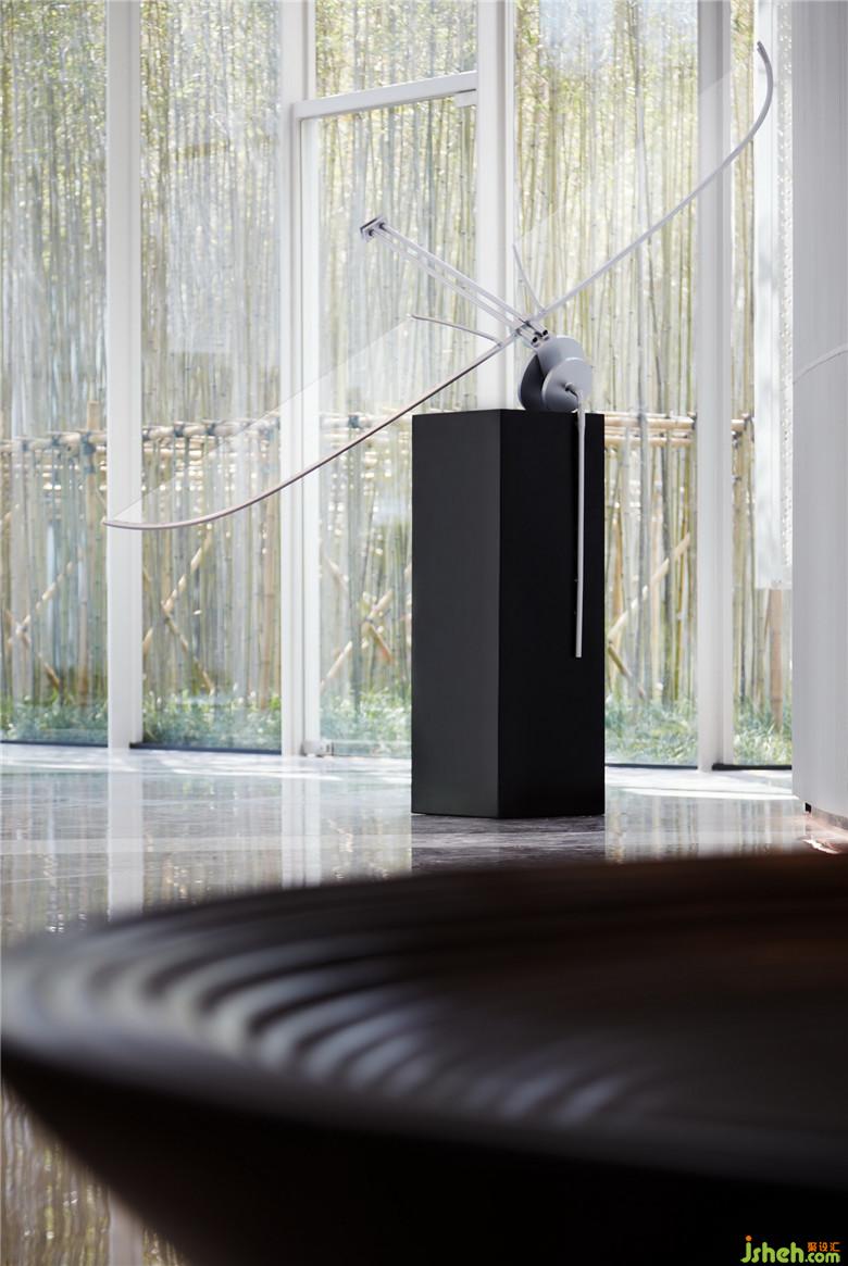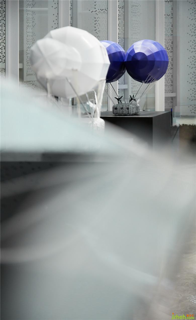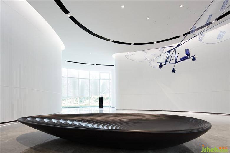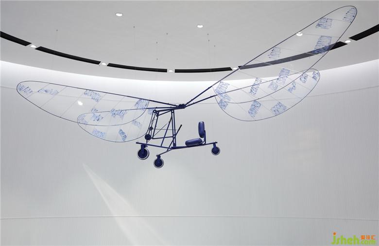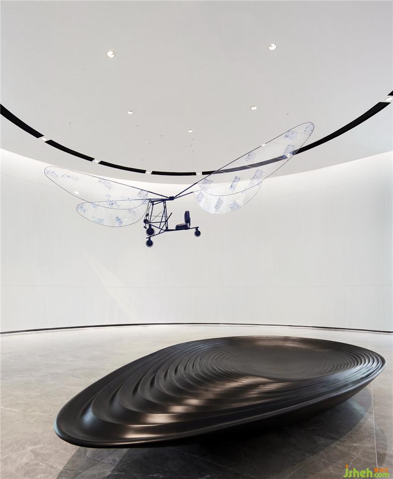 當(dāng)天空邂逅科技,飛行是永恒的旋律。共生形態(tài)以“飛行”為線索挑選相關(guān)藝術(shù)品與裝置,并以之關(guān)聯(lián)、穿透各個(gè)空間,形成清晰的導(dǎo)向系統(tǒng)。從前臺(tái)接待、區(qū)位展示、多媒體室到藝術(shù)長(zhǎng)廊,空間層層遞進(jìn),故事逐次展開(kāi):前臺(tái)錯(cuò)位懸掛的燈具,精美的圓形結(jié)構(gòu)宛如片片云朵漂浮,奏響空間序曲;環(huán)形幕墻下擺放的魔法飛行器,啟發(fā)觀者產(chǎn)生聯(lián)想;天花上的弧形燈槽似飛行的軌道,而大型飛行器就懸于半空;藝術(shù)長(zhǎng)廊擺放著各式熱氣球及飛行裝置模型,墻身的手稿畫(huà)、黑白照片記錄著其誕生的歷史;沙盤(pán)區(qū)上方設(shè)置藍(lán)色天鏡裝置回應(yīng)“天空”主題,鏡面反射作用突顯了整體空間的未來(lái)科技感,使每個(gè)區(qū)塊都有了特有的影子,形成空間獨(dú)有的記憶點(diǎn)。會(huì)所設(shè)計(jì)