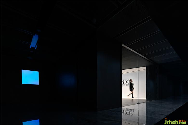 Interms of the design of the front hall, an oblique incision splits the space into two geometric blocks of unequal sizes, one beingcomplex, and the other being simplified. The diagonal line strengthens the relationship of the spatial depth of field and magnifies the visual impact: the triangular block is hidden in black, leaving only the white rectangular reception deskfeaturing framed scenery; the large andextending white rectangle gradually unveils the forward direction.