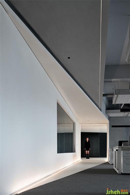辦公總部設(shè)計(jì)從接待前廳沿著白色空間轉(zhuǎn)向,進(jìn)入開(kāi)放式辦公區(qū)。白色三角體塊延伸進(jìn)來(lái),以對(duì)角線的塊面切割形成裸露的開(kāi)口。