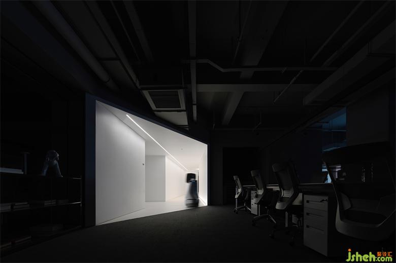 前廳的設(shè)計(jì)以一道斜向切口將空間分割成大小各異、一繁一簡(jiǎn)兩個(gè)幾何體塊,辦公總部設(shè)計(jì)對(duì)角線加強(qiáng)空間景深關(guān)系,放大視覺(jué)沖擊力:三角體塊隱匿于黑色之中,只在留下框景式白色矩形接待臺(tái);白色幾何大而舒展,以逐漸開(kāi)闊的方式暗示著行進(jìn)的方向。