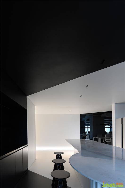 白色盒子的應(yīng)用,在這里并非只是單一的空間形式,它在公共辦公區(qū)通道的L形轉(zhuǎn)角前方,形成白色茶水間。