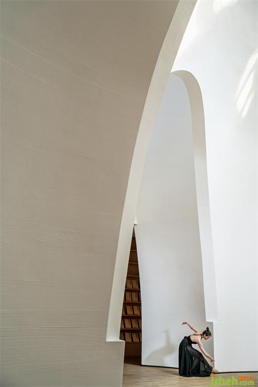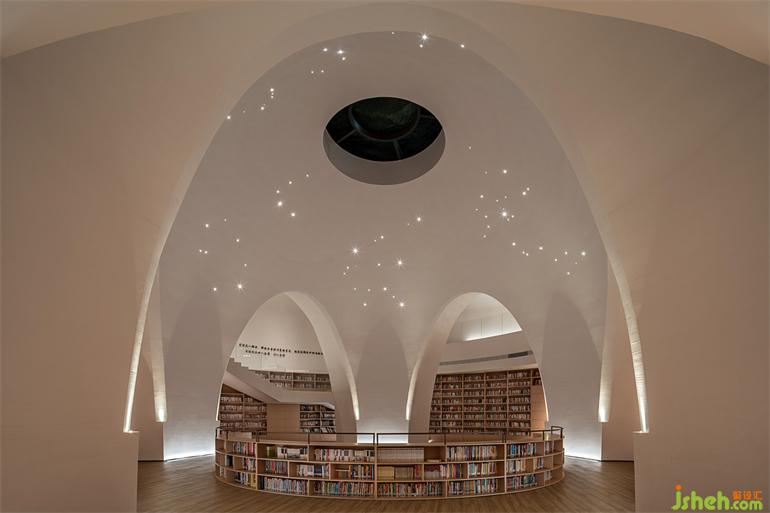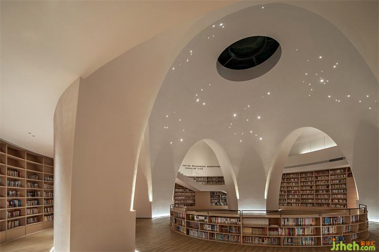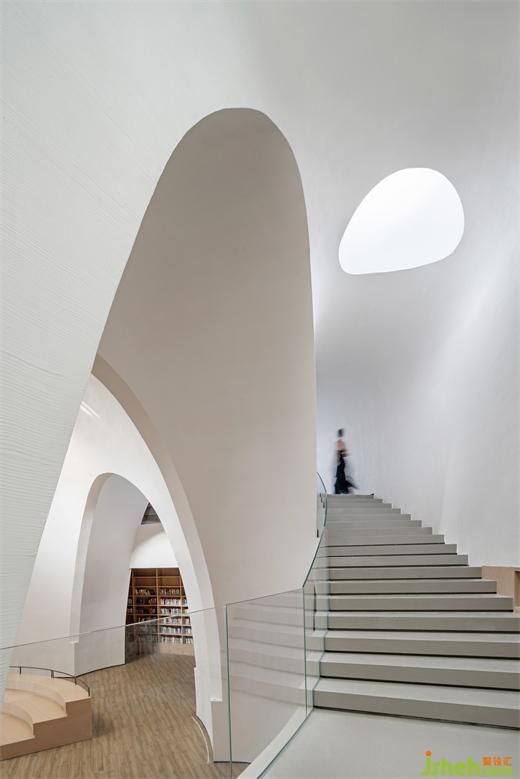 相對純粹的色彩表達結合輪廓弱化了柱體。在整個半弧形空間平面的盡端,是通往負一層書吧的入口,一片隱秘的星空靜待開啟。