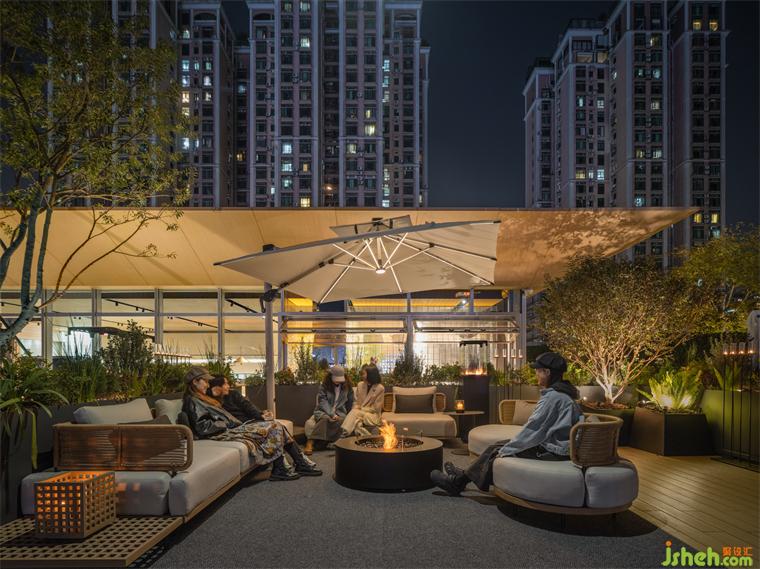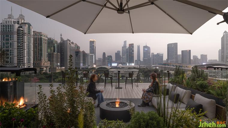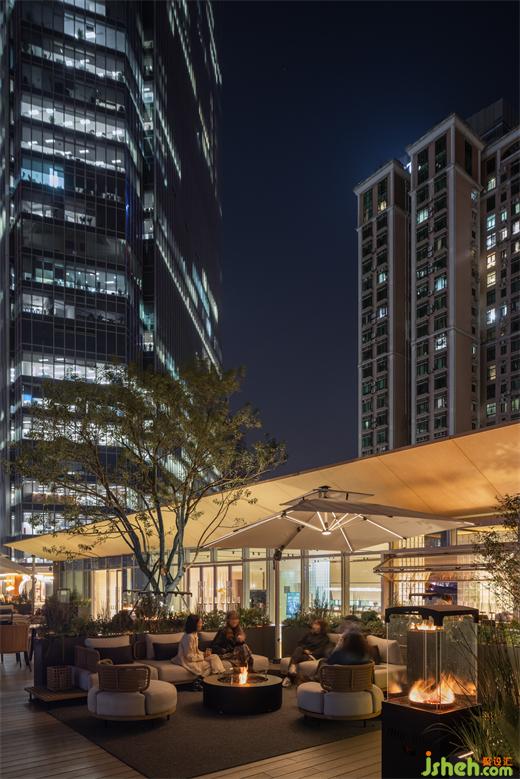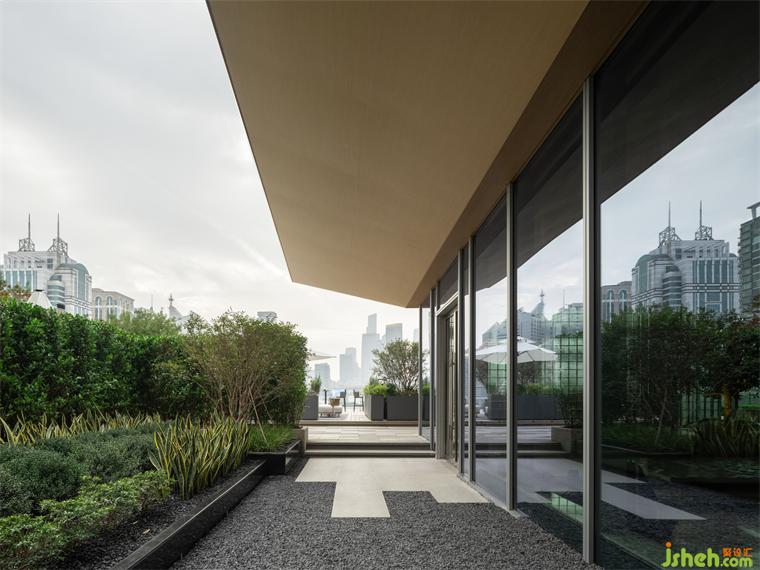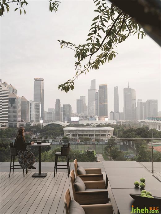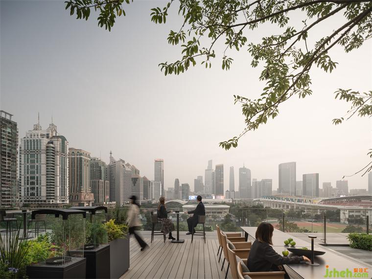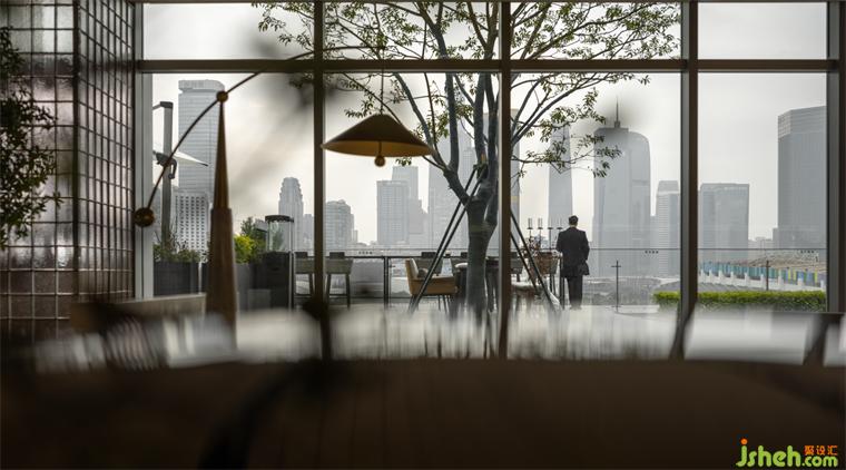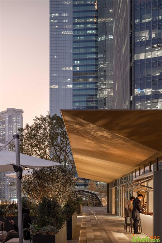 戶外平臺(tái)本是聯(lián)結(jié)不同樓宇間的屋頂,天際會(huì)所設(shè)計(jì)營造的氛圍讓諸多散落的時(shí)間在此匯聚。以樹這種具有人類集體記憶的符號(hào)為磁場,人們在此得到一種身體狀態(tài)和精神意識(shí)上的放松。建筑外觀斜向的屋檐延展至室內(nèi)天花,抬高的室內(nèi)空間與開敞的戶外平臺(tái)互滲,動(dòng)線與靜觀、舒緩與釋放、交匯與交流,這里誘發(fā)人們逐漸顯現(xiàn)內(nèi)心隱藏的對城市的深層情意。