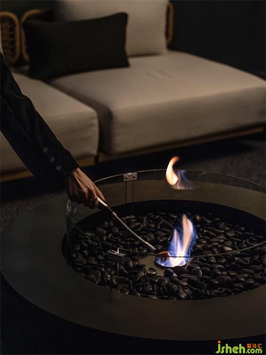 結(jié)合與平臺(tái)互通的小吧臺(tái),裝置在室內(nèi)與室外的交匯點(diǎn)呈現(xiàn),猶如一個(gè)磁場,與窗外真實(shí)的城市天際線重疊。