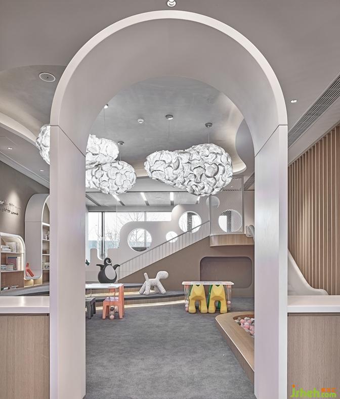 The children's entertainment zone is beside the property model display area, where kids can learn things through lively and delightful activities. The arc-shaped bookshelf, furniture from the Italian furniture brand ME TOO, combined with Legos, make the space interesting and visually attracting.