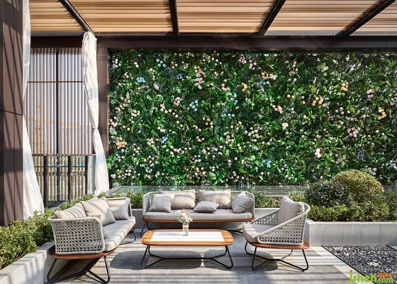 進(jìn)入二層映入眼簾的是通透溫馨的太太廚房,長條的開放式操作臺便于烘焙與交流,使整個(gè)空間互動且活潑。半透明墻面上的女性形象涂鴉充滿活力,張揚(yáng)且突出主題,簡潔的線條配合花卉裝飾,給予當(dāng)代女性全面的詮釋和表達(dá)。走出戶外,一片生機(jī)盎然的景象是野獸派花園的陳列。這個(gè)半開放式空間由遮陽頂與紗簾為邊線,戶外沙發(fā)套組的背后是一整面花草墻,與三五好友在此喝個(gè)下午茶聊聊天,雅致而沁心。