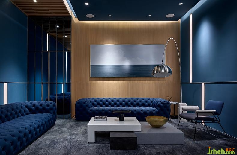 The private cinema is dominated by dark blue, making people comfortable and calm. Metal lines and mirrors are used to partition the space. TOM DIXON and B&B furniture and accessories improve the aesthetic appeal of the space, and also ensures privacy.