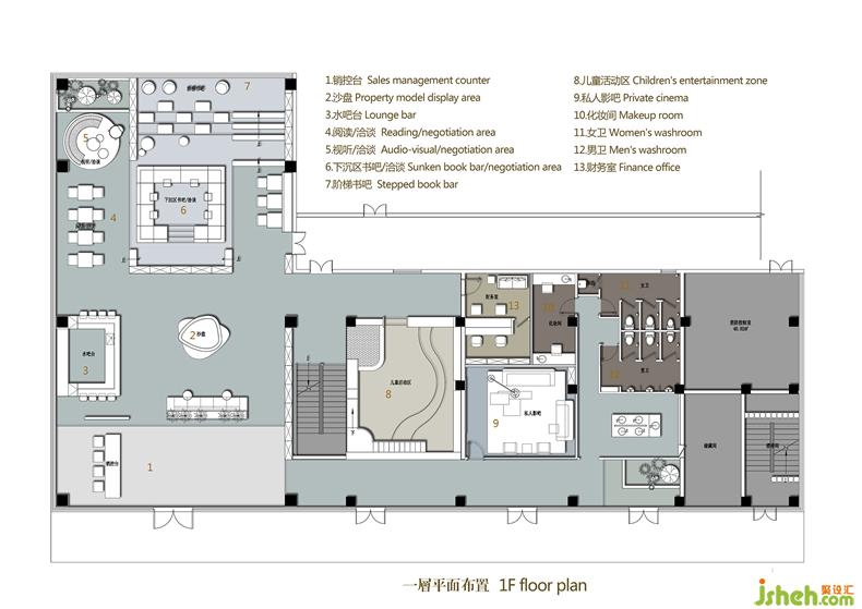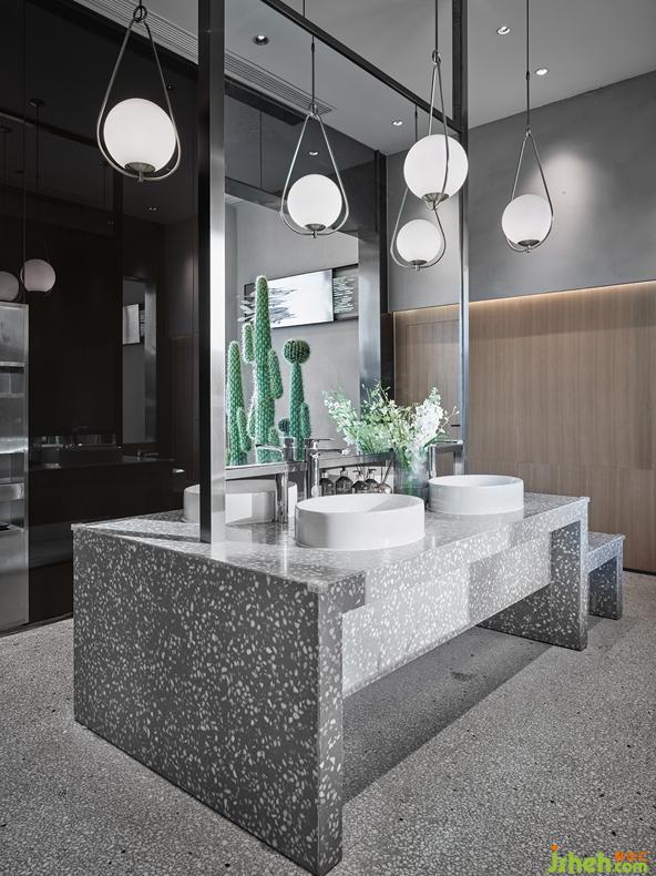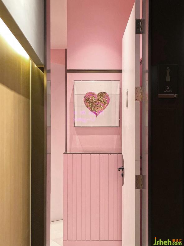 The design team adopted different color palettes in the men's washroom and women's washroom. A large area of pink produces a lovely atmosphere in the women's washroom and makeup room, and neon lamps on the wall add individuality and avant-garde stylishness to the space. In contrast, the men's washroom is characterized by turquoise color, in which the painting of geometric shapes enriches the sense of structure in the space. Besides, TOM DIXON toiletries placed in the washrooms can serve for people's pursuit of a quality life.