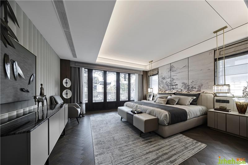 走上樓梯,私密的臥室空間隱藏于此。主臥窗明幾凈,寬敞舒怡。春江綿山閑亭聚的悠奕景象依附床頭墻上,剩余墻面則選擇弧形布藝硬包,意味深遠(yuǎn)。
