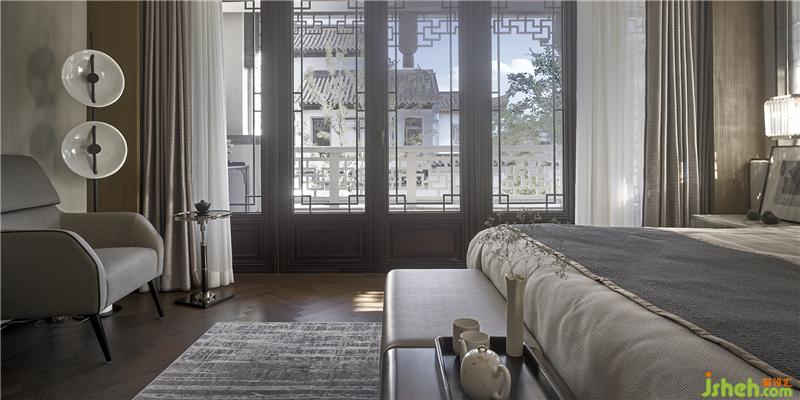 一層內(nèi)間享有庭景的儒雅居室便是老人房。一窗、一門、一畫,清簡(jiǎn)的線條于歲月相匹配,中性色調(diào)的臥房帶給長(zhǎng)者平靜與安寧。