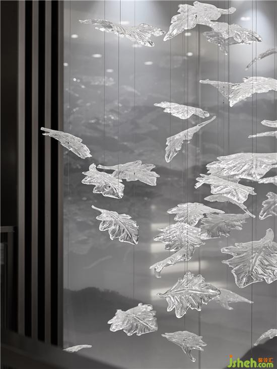 從客廳向下,樓梯上的云多拉灰大理石將客廳的娓娓雅清連接于此。走道安有山水紋藝術(shù)玻璃,延續(xù)著溫婉意境,心悅神怡。月影逐光的書房在地下夾層一端,閑默的格調(diào)為屋主辟置一處獨(dú)享空間。護(hù)欄外,吊頂散落而下的透明葉片,以無拘的現(xiàn)代語言詮釋自然,宛若天成。