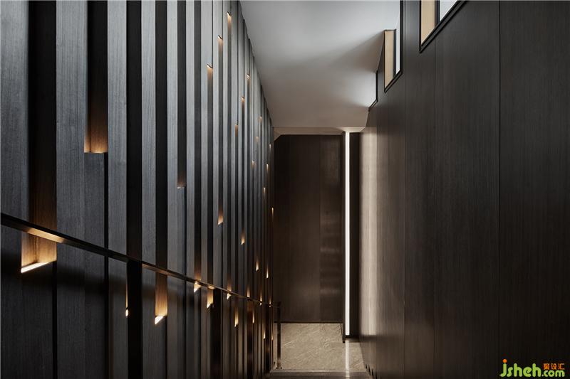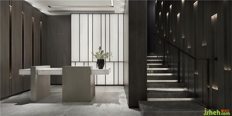 木飾面立方體交錯拼接而成的墻面占滿樓梯一側空間,光束沿著內(nèi)凹體塊循序漸變,歷史的厚重感不言而喻,這是光與空間共造的藝術。會所設計