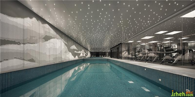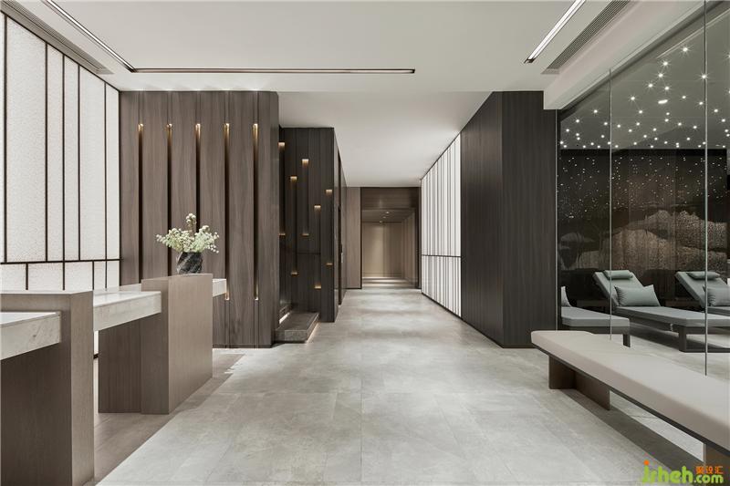 泳池墻面,用現(xiàn)代手法詮釋著江南山水,吊頂星光點點,趣味盎然。休息區(qū)墻面采用保加利亞灰?guī)r板,反射了空間光線,通透輕靈。健身房大面積木紋,則使之充滿自然氣息。更衣室沿用暖灰色調(diào),大理石與木紋搭配,質(zhì)雅低調(diào)。會所設計