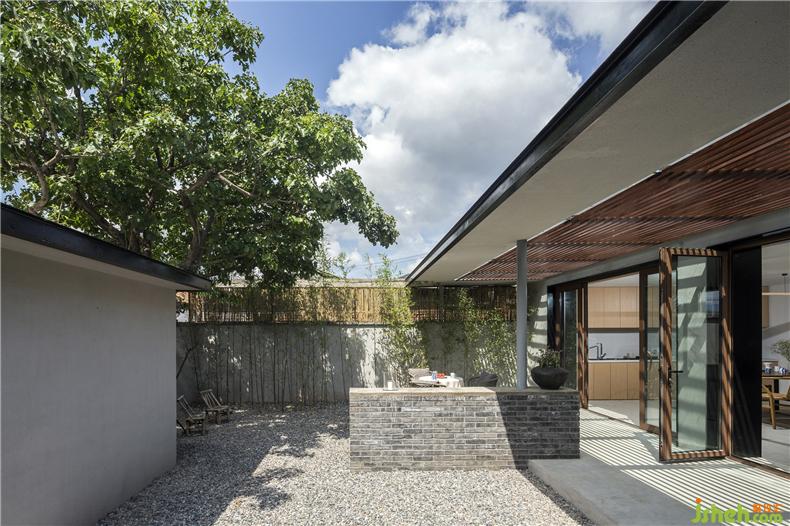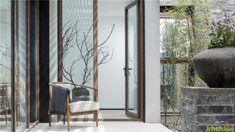 為了實(shí)現(xiàn)庭院視覺的穿透性和連貫性,建筑師以大面積玻璃作為首層南北立面的主要材料,置身室內(nèi),可觀春華秋實(shí)、晨昏霧靄,聽雨打石板地的清脆聲響,讓自然風(fēng)光成為生活風(fēng)景。而這種開放又與院外相隔,充分保障了居住空間的私密性,室內(nèi)設(shè)計(jì)師這也是對傳統(tǒng)民居內(nèi)向性審美的一種延續(xù)。