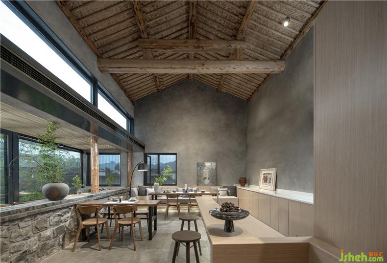 為了滿足商業(yè)屬性空間應(yīng)有的尺度感與使用靈活性,建筑師將坐北朝南的主體建筑加高至兩層并做了通高處理,容納室內(nèi)就餐活動(dòng)?!袄认驴臻g”由“紅果樹(shù)”延續(xù)至此,滿足半室外就餐的需求。而庭院之中,室內(nèi)設(shè)計(jì)師暖色編織質(zhì)感的沙發(fā)椅圍合出一種歡聚的氛圍,水泥花壇里野蠻生長(zhǎng)的綠植、竹子與石墻面為近景,矮山與藍(lán)天為遠(yuǎn)景,讓就餐的氛圍更加“原生態(tài)”。