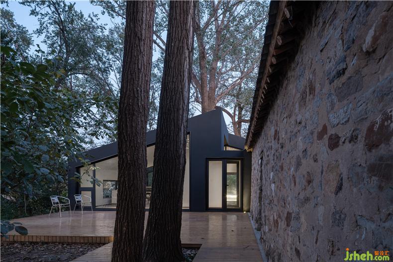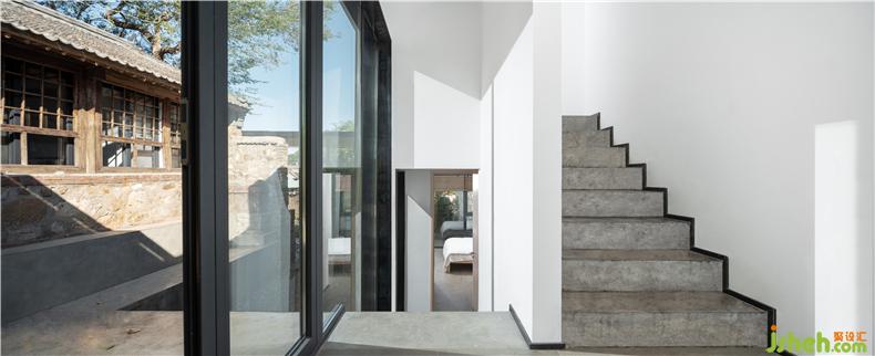 如何對待傳統(tǒng)建筑一直是鄉(xiāng)建最需解決的問題。室內(nèi)設(shè)計(jì)師作為曾經(jīng)的農(nóng)業(yè)大國,中國文化的鄉(xiāng)愁濃縮于鄉(xiāng)村,“原汁原味”固然延續(xù)記憶,卻存在著種種問題:傳統(tǒng)建造材料和結(jié)構(gòu)讓建筑的開窗面積受限嚴(yán)重,降低了采光舒適度;面向鄉(xiāng)野而來的都會客們既向往傳統(tǒng)的生活方式,也希望能夠享受現(xiàn)代化的便利,他們的體驗(yàn)式居住狀態(tài)和村落原住民大不相同。設(shè)計(jì)師并不贊成“反現(xiàn)代”的表演,但也認(rèn)可共同記憶與情感的價(jià)值。于是,他們以老房子作為空間的核心,以一種象征性的符號滿足來客對“原生態(tài)”的向往,部分石墻作為一種文化符號由老房子發(fā)散而出,作為院落的裝飾性外墻。民宿設(shè)計(jì)