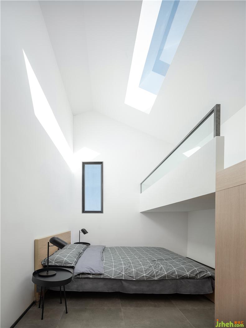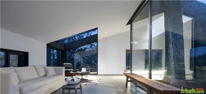 除客廳內(nèi)庭院的設(shè)計(jì)外,場地內(nèi)的觀景平臺也為原有樹木的存續(xù)而退讓,民宿設(shè)計(jì)最大程度地減少了營建行為對場地生態(tài)的破壞。室內(nèi)以大面積白墻為底,如同幕布,讓樹影婆娑投影其上,這種處理手法同時(shí)響應(yīng)了成本、尺度和場地記憶。