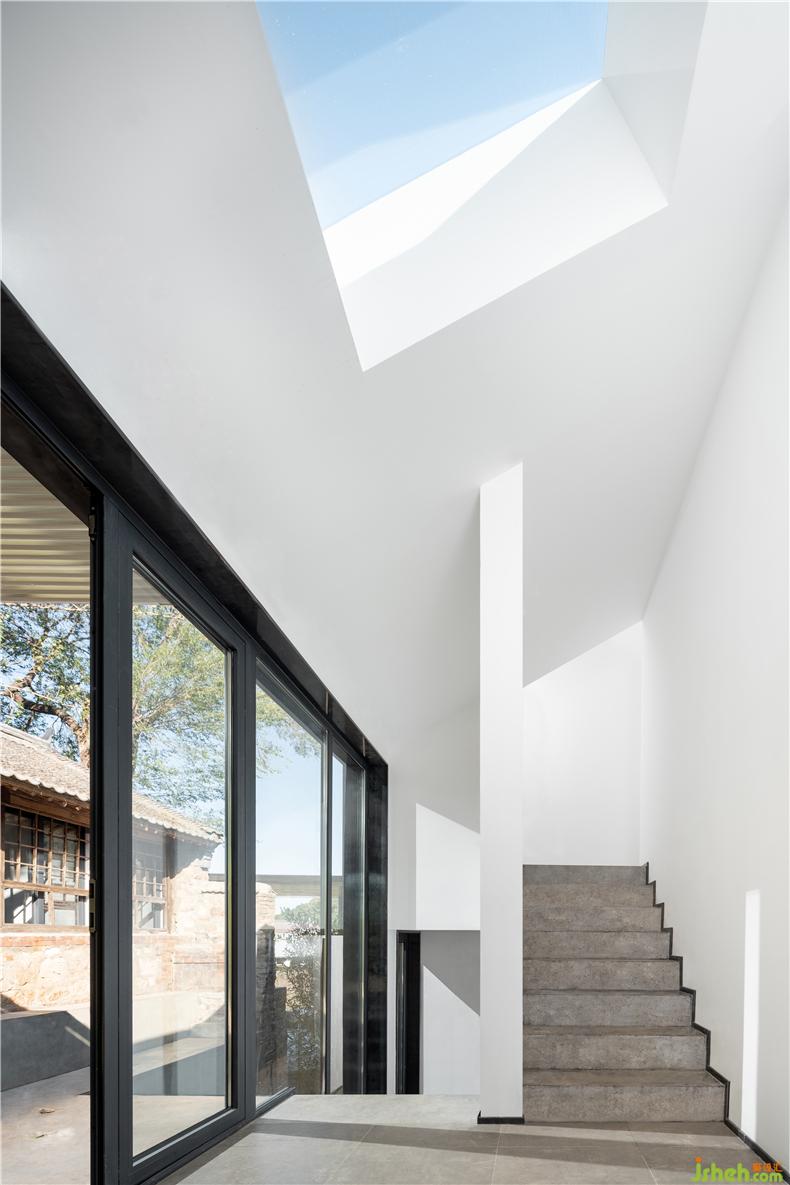 而真正的居住空間位于老房子的南側(cè),灰色的水泥房子按照老房子的形態(tài)與比例而營建,卻因現(xiàn)代結(jié)構(gòu)的介入而能開設(shè)大小不一、高低錯(cuò)落的窗戶與天窗。材質(zhì)上,主建筑清水混凝土外墻與石墻一樣,以“粗野”的形態(tài)裸露于觀者眼前,形成現(xiàn)代語境下的“原汁原味”。