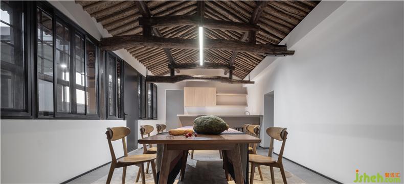老房子作為了新院子的餐館,內(nèi)部的屋面結(jié)構(gòu)被保留、加固,天然成為一種裝飾,提醒著觀者此處一切食物孕育自天地自然。室內(nèi)的家具與器物亦與之相匹配,圓潤的木材以天然的色澤再度強(qiáng)調(diào)空間的質(zhì)樸雅趣。