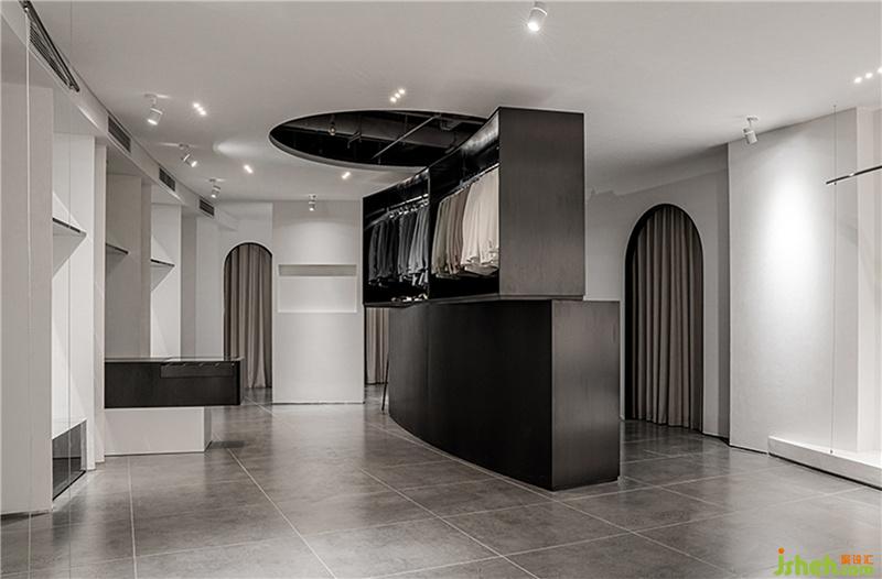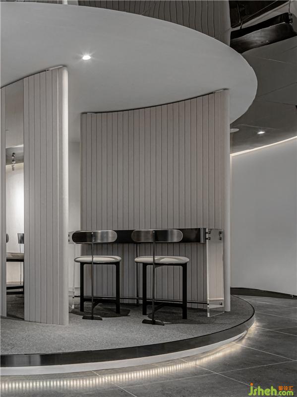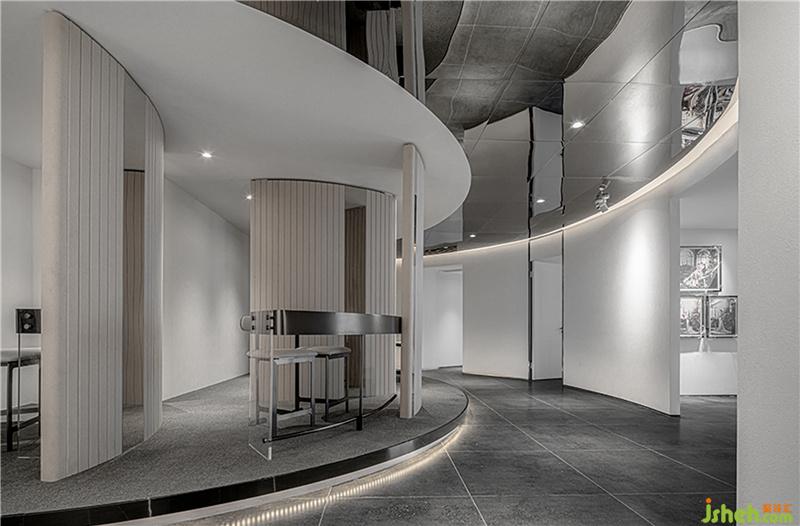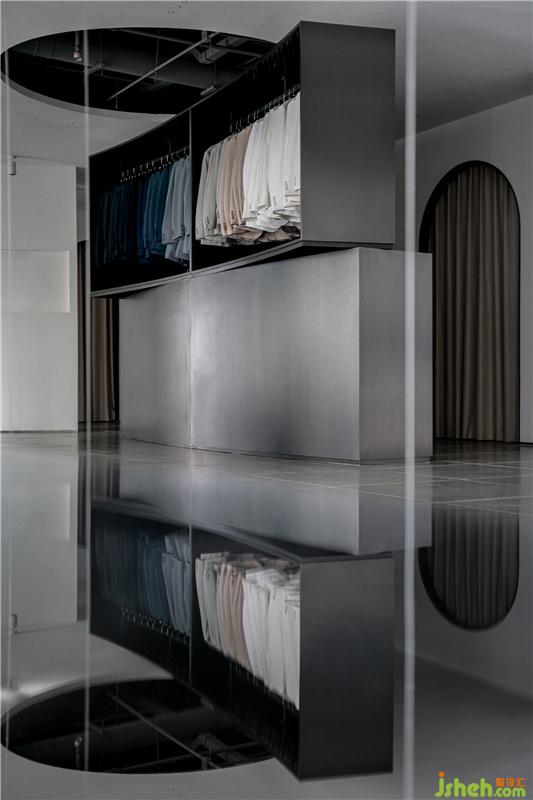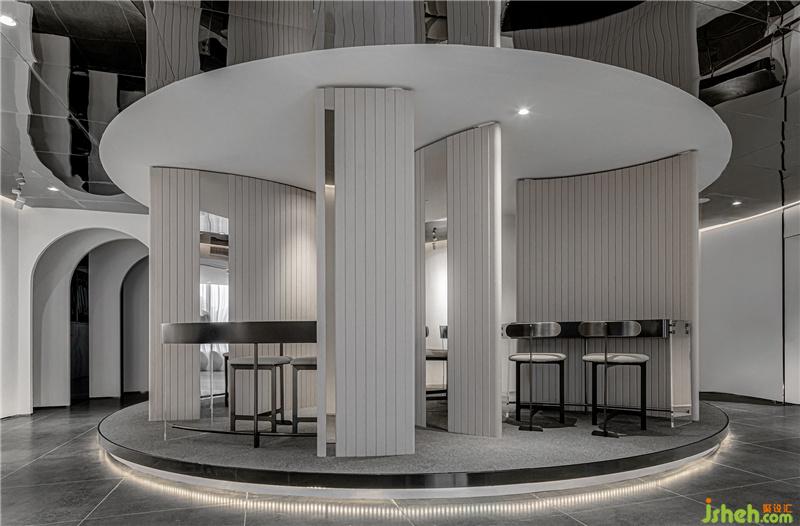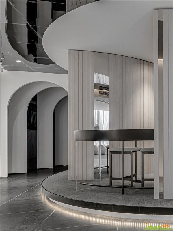 弧形的金屬板建造,流露出經(jīng)典而浪漫的一面。過廊左右分設(shè)化妝間與展示區(qū),層次貫穿加重了視覺體量感,完美地融合了頂面和地面。簡(jiǎn)約大方而又富有設(shè)計(jì)感,柔美中滲透著莊重感。