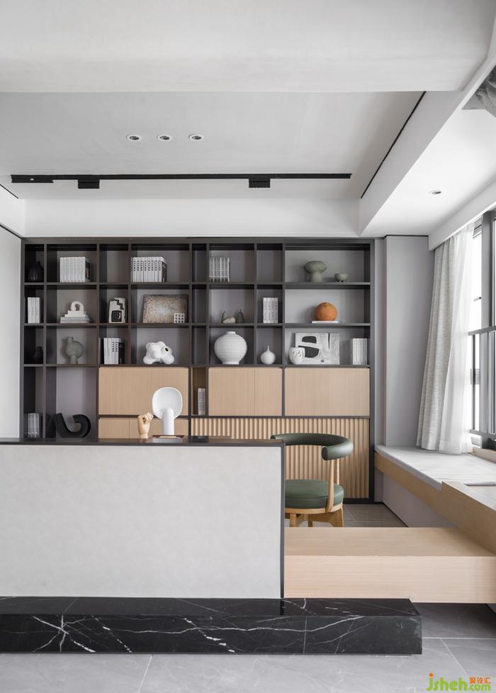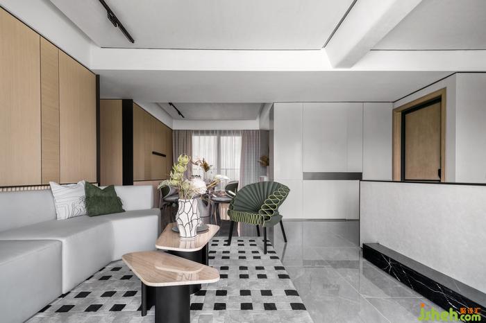 對于交流和共享屬性更高的的客廳,樣板間設(shè)計師在陳設(shè)上降低空間視覺重心,選用低矮沙發(fā)和家具,強(qiáng)調(diào)談話交流的親密感與舒適度。在多種材質(zhì)與色彩的混搭下,設(shè)計開啟生活多元的空間體驗。