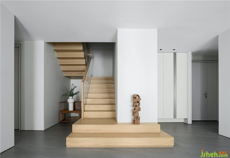 樓梯坐落于客廳一側(cè),豪宅設(shè)計師運用極簡現(xiàn)代藝術(shù)的設(shè)計手法,融入木雕、木紋、中式扶手椅等人文藝術(shù),在空靈與東方意境中凝練出獨特的空間氣質(zhì)。