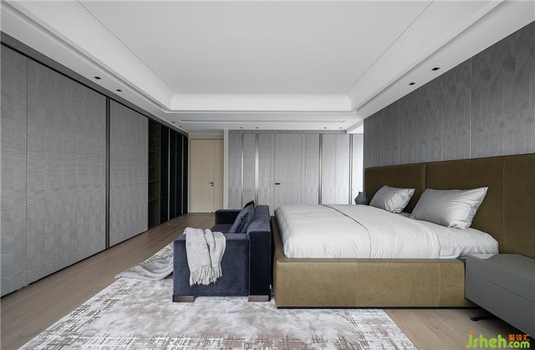 主臥室延續(xù)了公共區(qū)域的風(fēng)格,采用極簡現(xiàn)代的設(shè)計風(fēng)格,詮釋越簡單、越舒適的美學(xué)原則,全景落地窗搭配優(yōu)雅的皮質(zhì)軟包床和深藍色沙發(fā)讓整個空間清爽又高級。