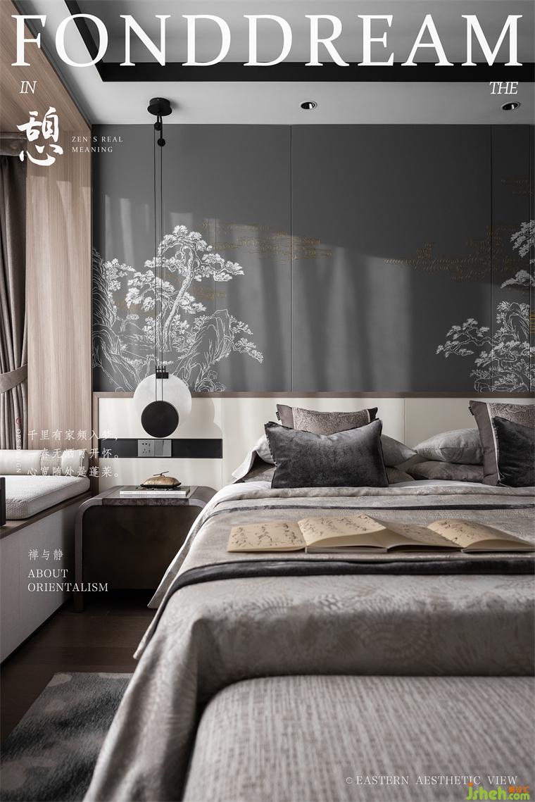主人房里以簡約的元素表現(xiàn)東方風(fēng)格的古樸大方,將奢華嵌入軟裝的細節(jié)之中。