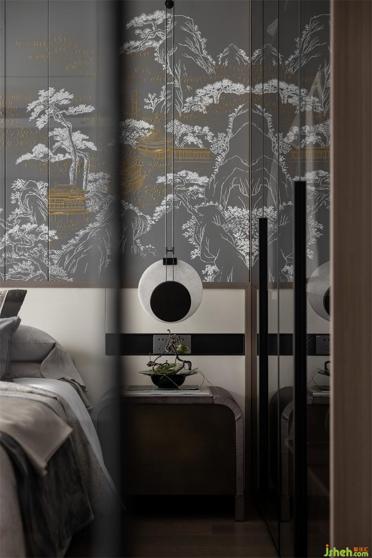 極具中式特色的對稱燈具墜于床頭兩側(cè),長沙樣板間設(shè)計沒有過多的裝飾與色彩,印證了設(shè)計師對中式美學(xué)的呈現(xiàn)。