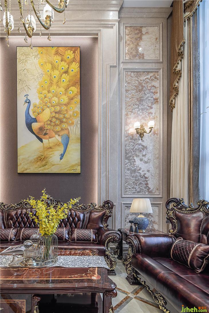 材質運用上,同色系軟包背景墻銜接大面積的石材墻面,延展空間尺度的同時,充滿轉折的美感。深褐色的沙發(fā)擺放在一幅孔雀掛畫前,整個空間的色彩層次豐富明朗。