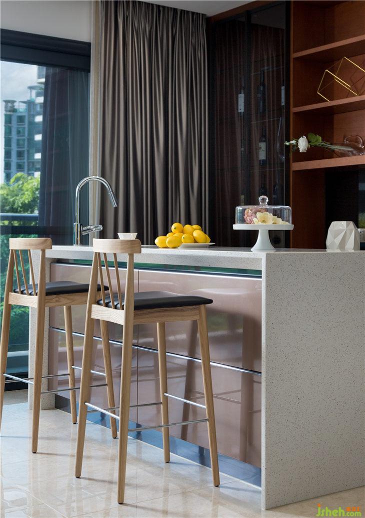 天地之間,只有光是永恒的存在,大面積的落地窗引入光。白天光線靈動(dòng)的闖入,掃盡黑夜的陰霾,使得餐廳充盈的木香余味悠長(zhǎng)。中島臺(tái)與餐廳的互動(dòng),體現(xiàn)出動(dòng)線的靈動(dòng)之處,虛與實(shí)的結(jié)合,讓生活程序完美而優(yōu)雅的呈現(xiàn)。素美的木質(zhì)餐椅與酒柜,散發(fā)著現(xiàn)代都市人在東西方文化影響下力求中庸持平的日常態(tài)度,還帶有一絲文人雅士的恬淡意味。